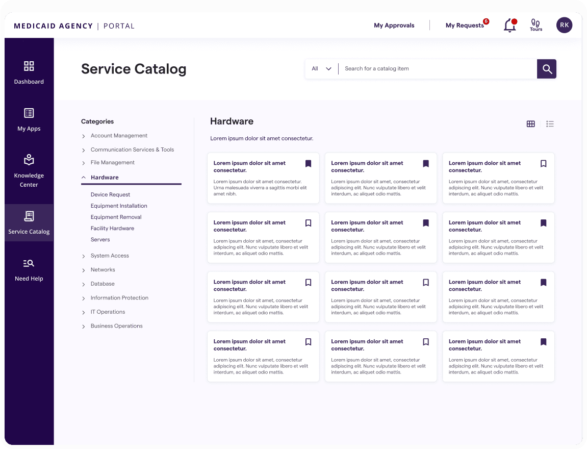 Service Portal redesign to streamline a state’s medicaid org’s employee user experience when submitting IT service requests.