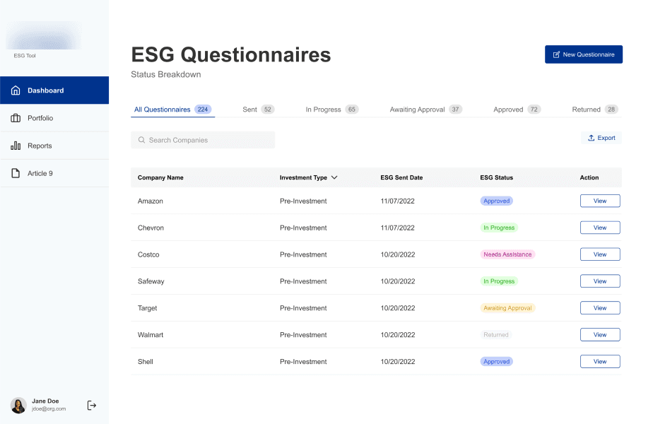 Redesigned the dashboard to make it easier for analysts to track questionnaire status, search and filter by investment type and completion stage, and quickly initiate new ESG assessments. The improved hierarchy reduced visual noise and helped users identify key actions more quickly.
